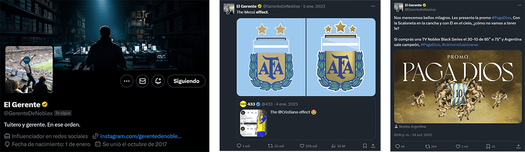 Noblex tiene un perfil de Instagram y Twitter de su Gerente que es una figura que se hizo conocida por una acción de marketing hace muchos años. Desde Calle 59 creamos sus cuentas en RRS donde habla de fútbol, espectáculos y cualquier tema de coyuntura para poder acercarse a la audiencia.